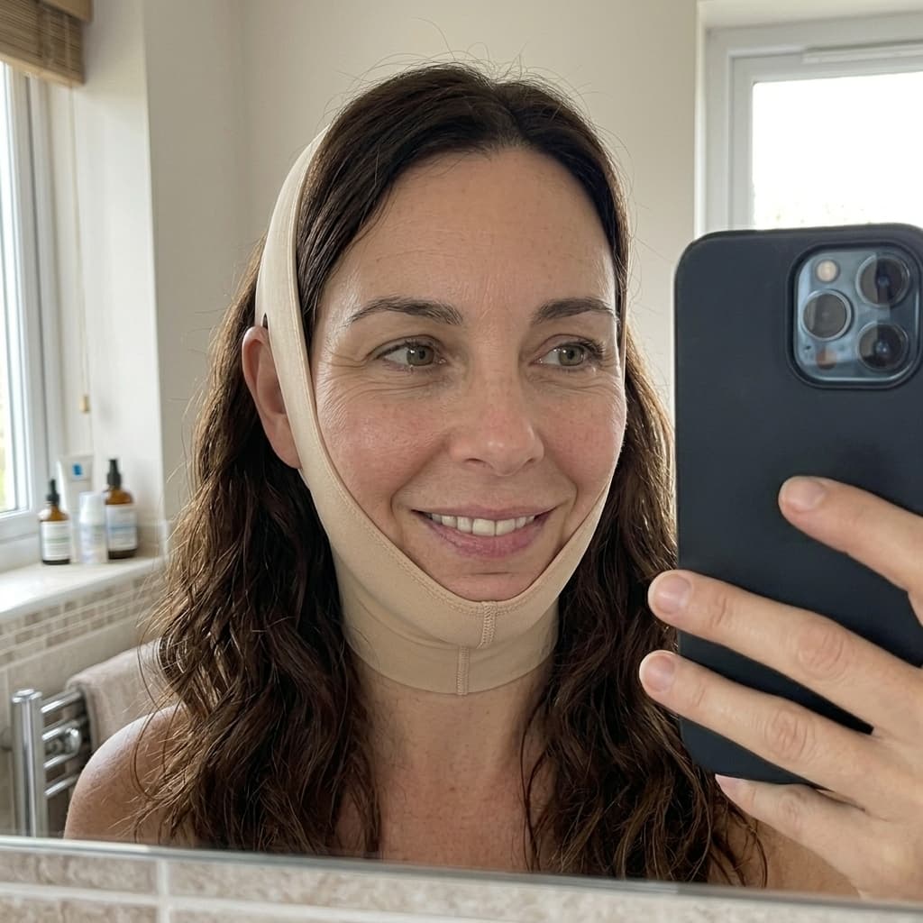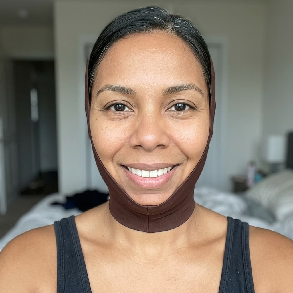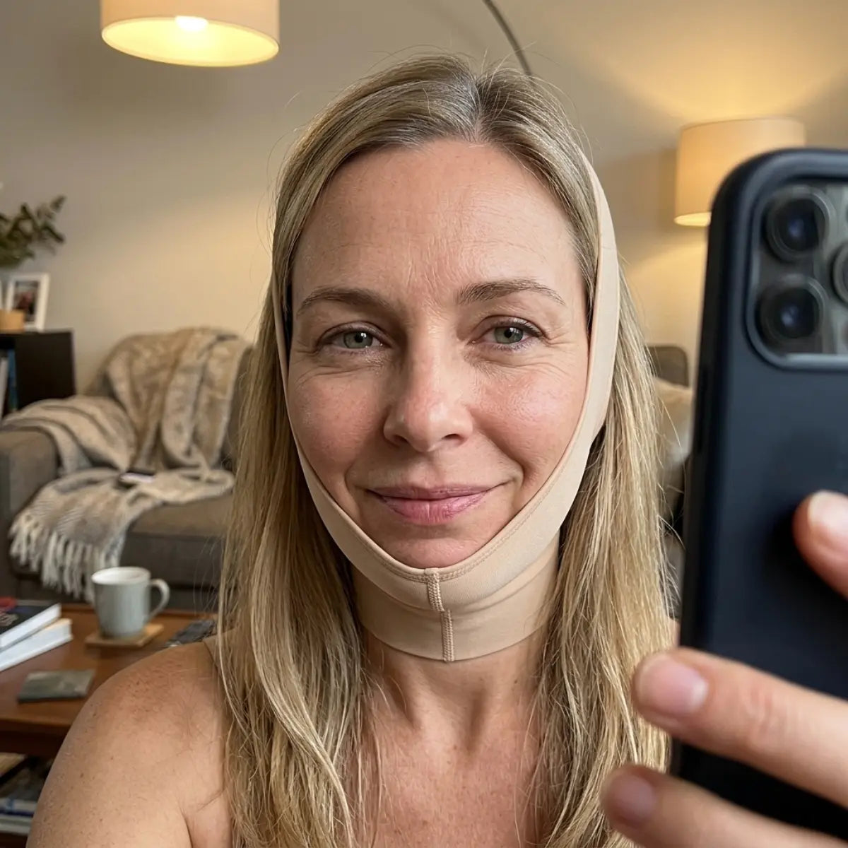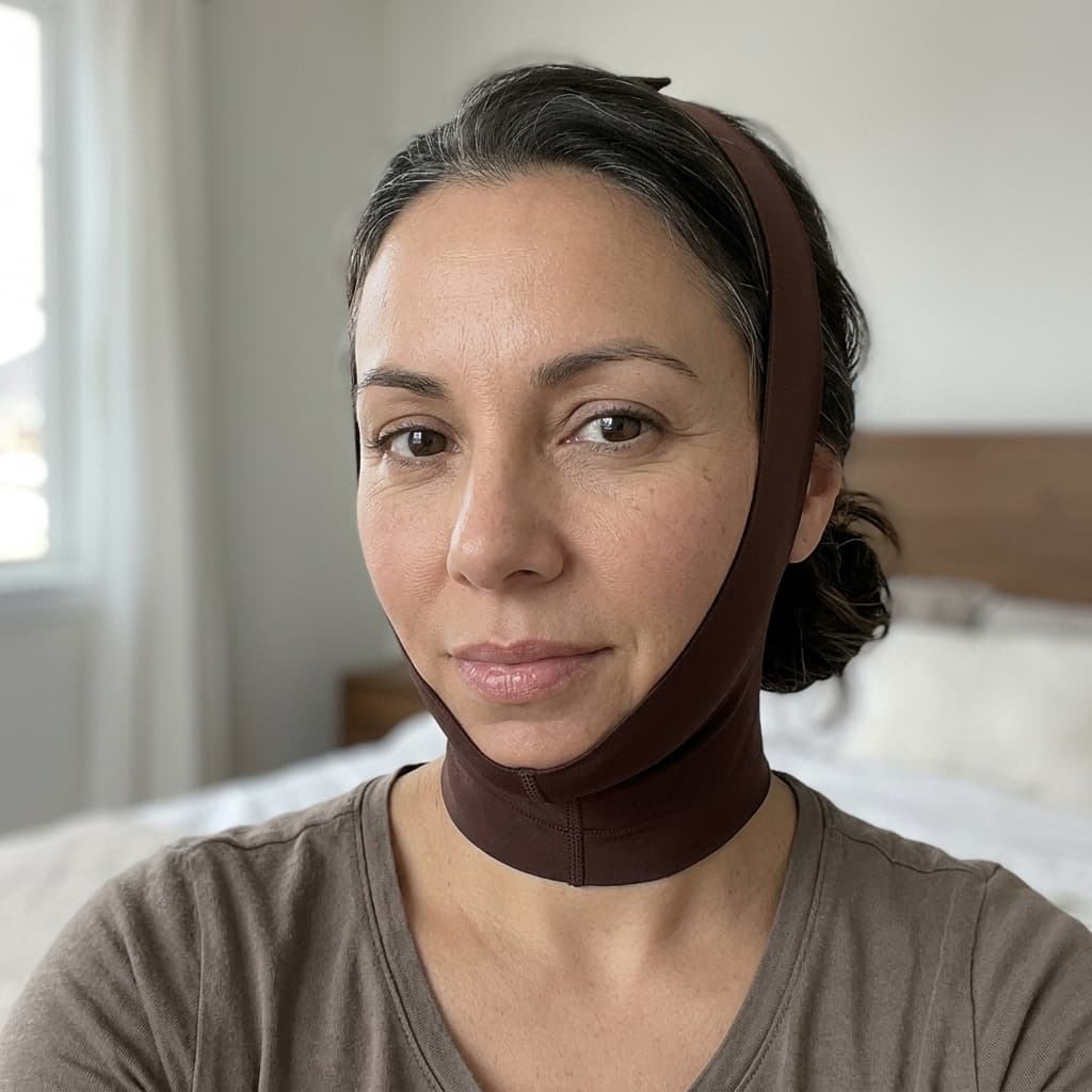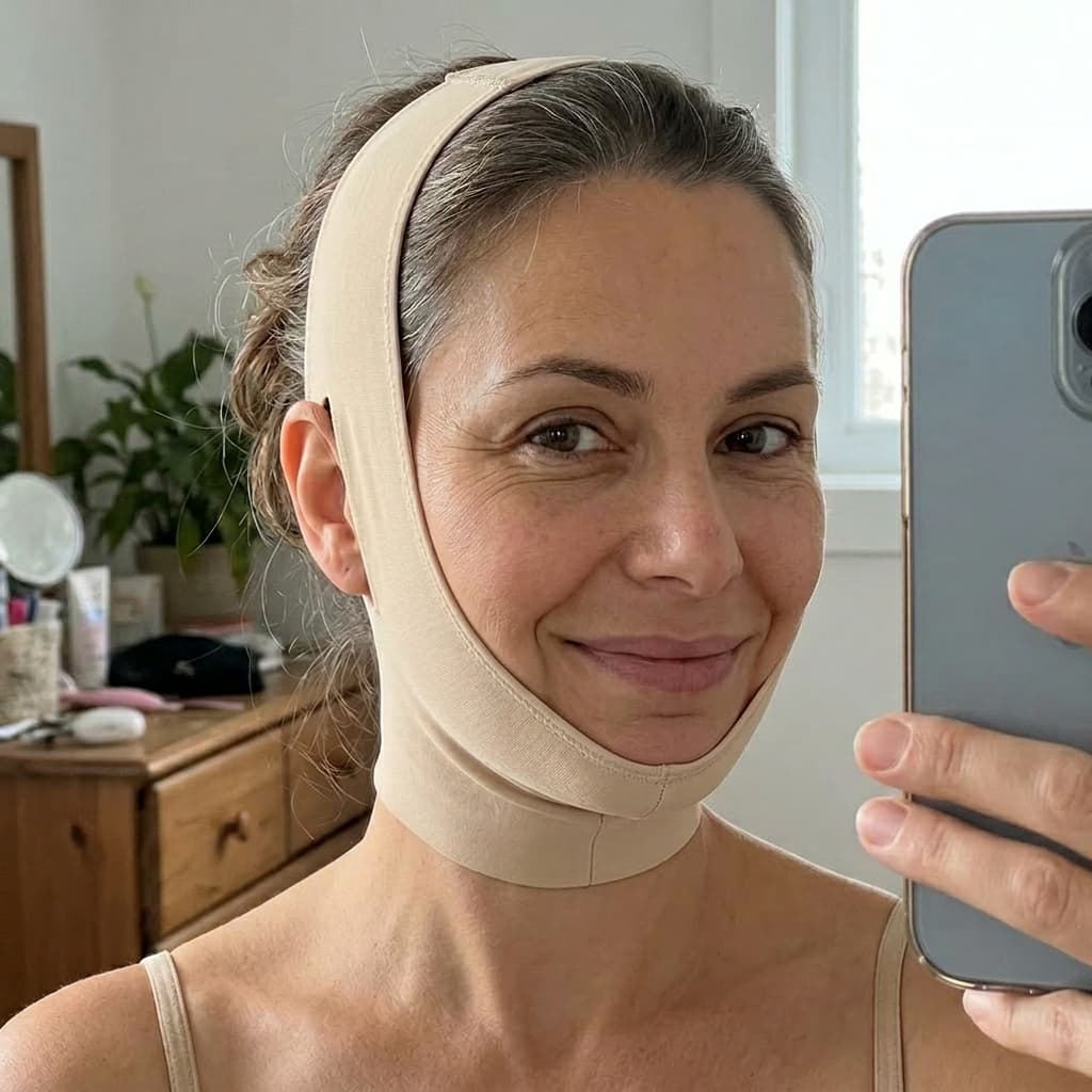 Dès les premiers jours, votre visage semble plus reposé au réveil. La compression active relance le drainage lymphatique — les fluides stagnants se libèrent. Le bas du visage paraît moins lourd, moins gonflé. C'est là que vous commencez à vous dire que ça marche vraiment.